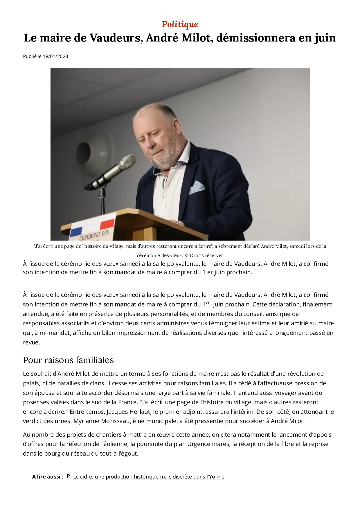 Le maire de Vaudeurs, André Milot, démissionnera en juin